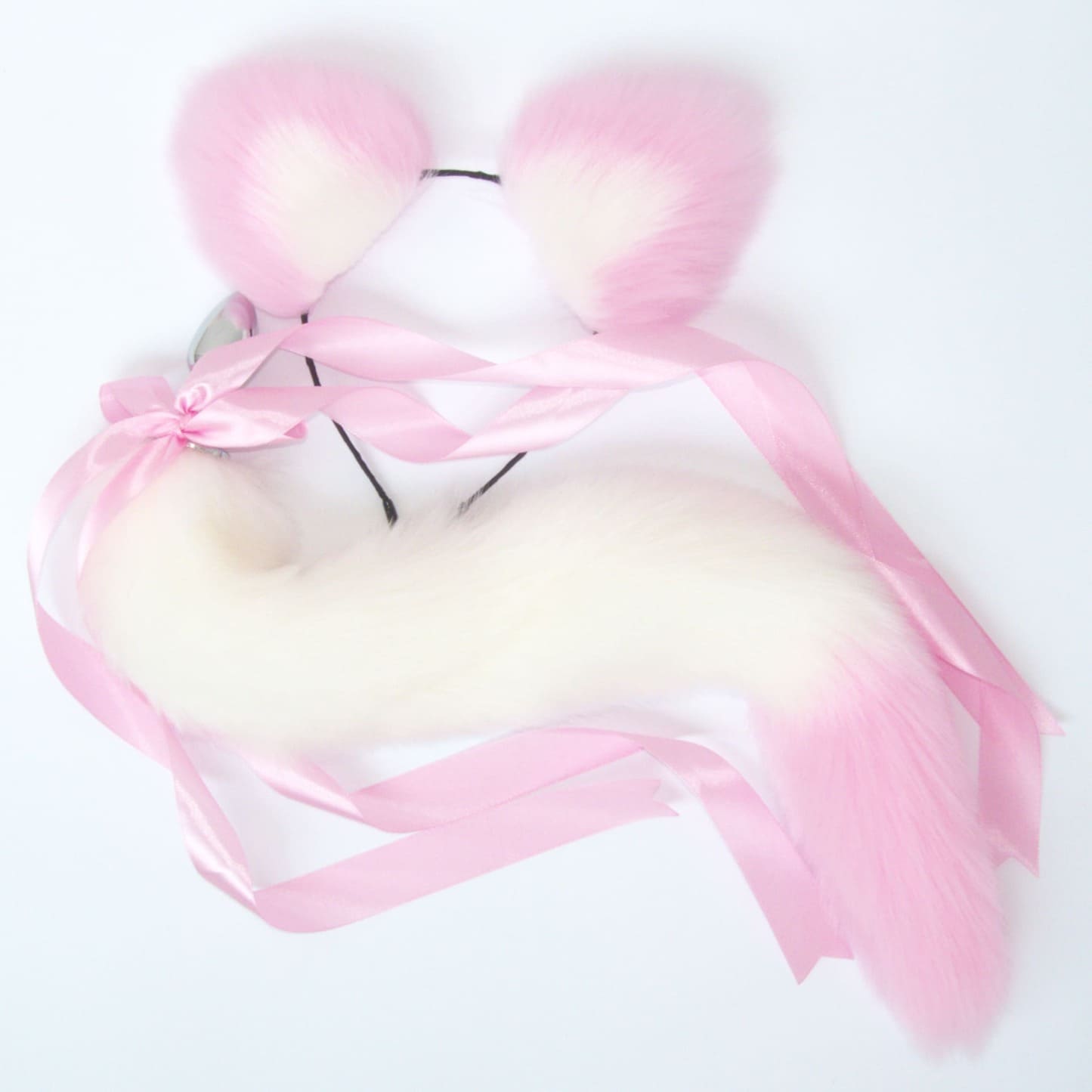 White and Pink Cat Tail & Ears Set (20" Tail) - Detachable Butt Plug